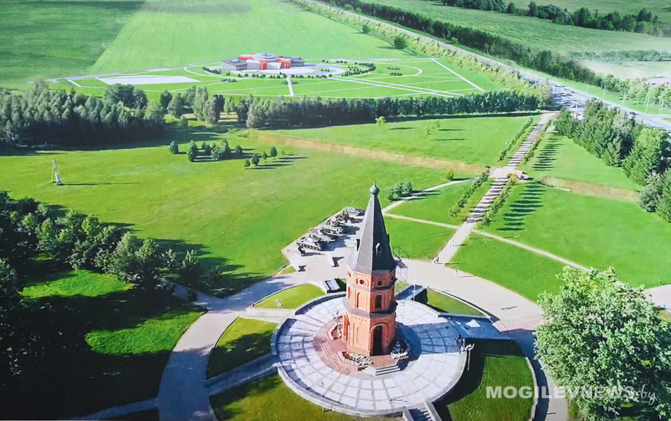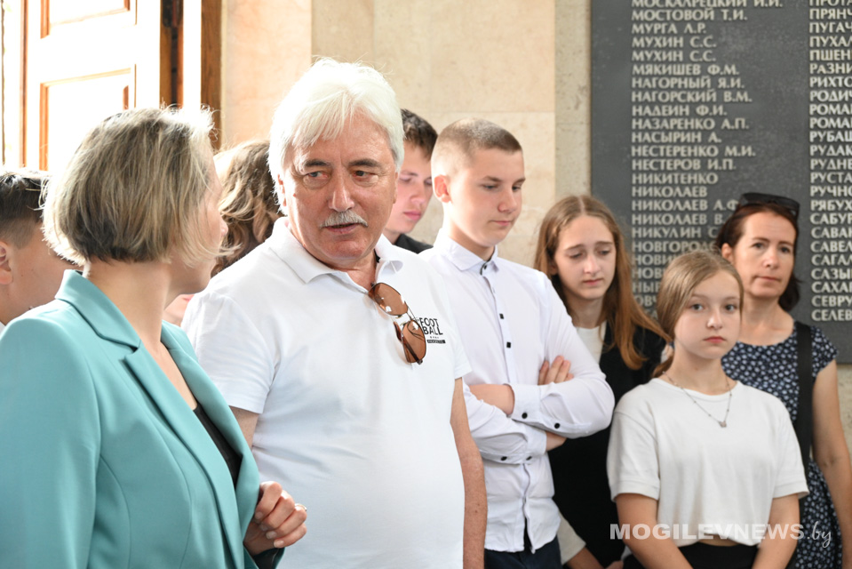 Александр Горошкин и руководитель Могилевского областного историко-патриотического поискового клуба «Виккру» Николай Борисенко рассказали женщине о Буйничском поле и строящемся Музее Славы Могилевской области в районе мемориального комплекса «Буйничское поле».